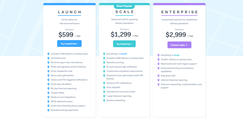 Onfleet’s Launch plan now starts at $599 per month for roughly 2,500 delivery or pickup tasks, with the Scale plan at $1,299 dollars per month for 5,000 tasks and extra features such as barcode and ID scanning. Enterprise pricing begins at $2,999 per month and is aimed at operations that are already handling very high volumes.