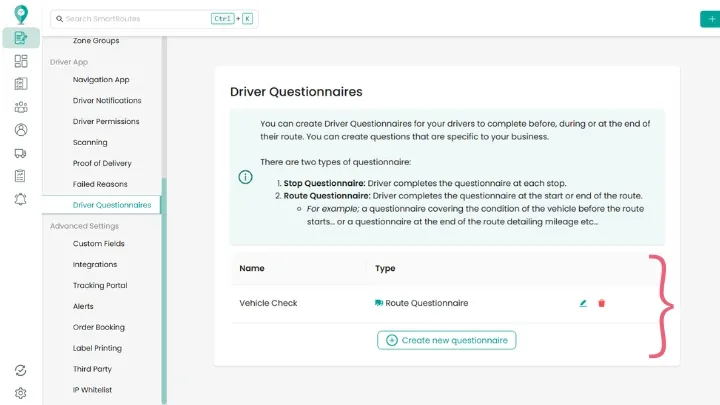 To create a questionnaire in SmartRoutes, go to Settings and select Driver Questionnaires from the left-hand navigation menu. Click Create New Questionnaire.