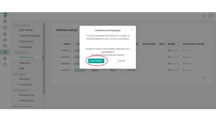 If you are adding more vehicles than allowed for in your current subscription, you will see the below pop up message. If you do not wish to add another vehicle to your account you can stop here. If you do still wish to add a vehicle, then click ‘Add Vehicle’ and your subscription will be updated to account for the extra license.
