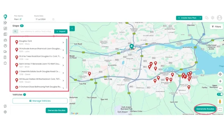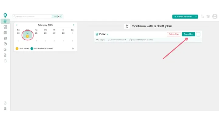 To find your draft route, click on the date of the plan on the calendar on the left. A list of routes planned for that day will appear. Click ‘Open Plan’ to proceed.