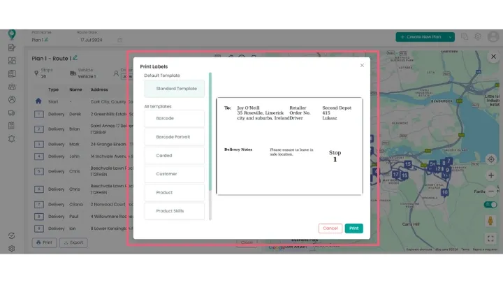 If you are on the premium subscription or higher you will be able to print labels directly from SmartRoutes.