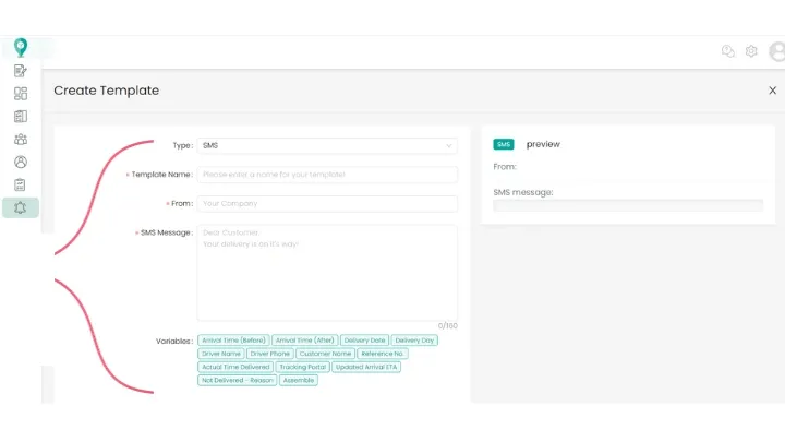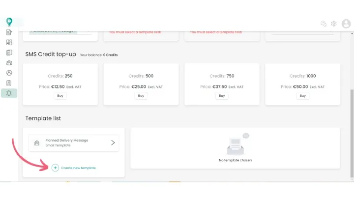 To create new templates, scroll down to the end of the page and click ‘Create new template’. You will be able to add in whatever text you require and you can also add in some preset information that will update automatically for eg. planned arrival time and tracking links.