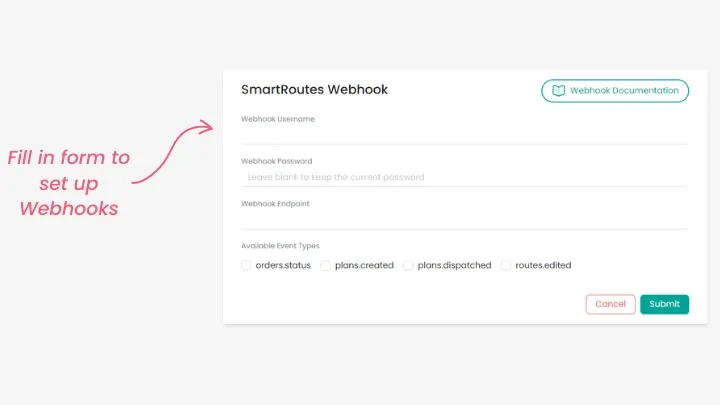 Simply head over to the Integrations section in your SmartRoutes settings menu, choose Webhooks, and fill out a short form.