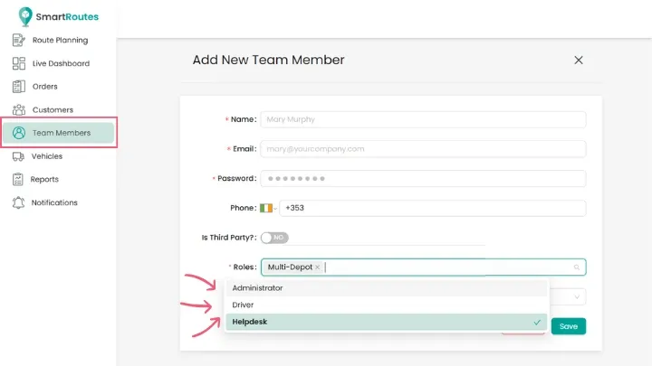 - Complete the required fields, including the team member's name, email, and role (Administrator, Driver, Helpdesk, or Multi-Depot Administrator).